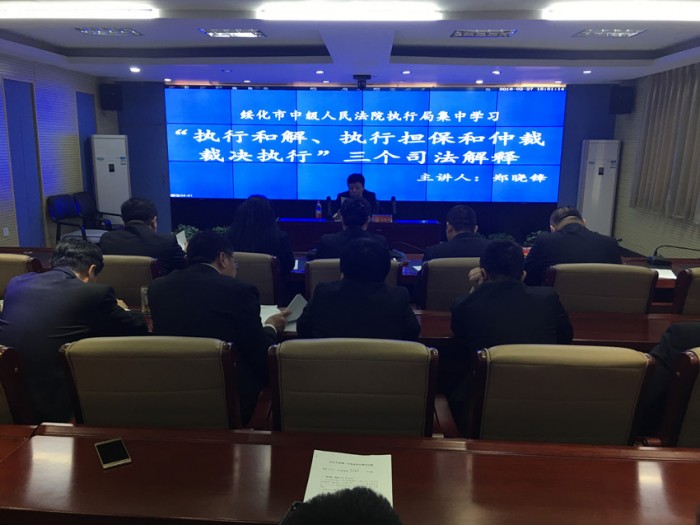 2月27日下午,中院执行局组织全局干警进行了第二次业务理论学习。执行局副局长郑晓峰对最高人民法院新发布的《关于执行和解若干问题的规定》、《关于执行担保若干问题的规定》、《关于人民法院办理仲裁裁决执行案件若干问题的规定》三个司法解释做了详细的解读,这三个司法解释作为执行规范体系的重要组成部分,将于2018年3月1日开始施行。