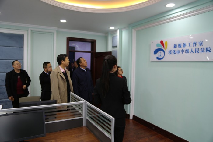 在信息宣传中心,大家依次参观了记者接待室、新闻发布厅和新媒体工作室,详细了解了我院新闻发布制度和发布会召开情况,并扫描了我院官方微信和官方微博的二维码,随时关注法院工作动态。