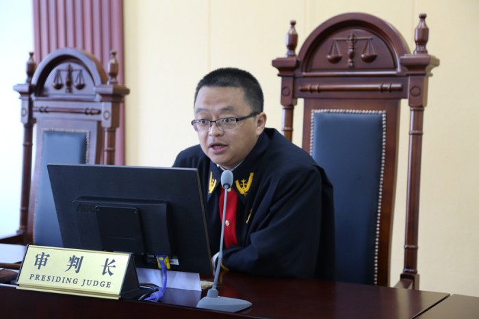 在审判法庭内,讲解员为大家介绍了法台、法椅、法槌和法徽的含义。师生们坐在法庭上体验法官的工作,感受法律的神圣和法院的威严。